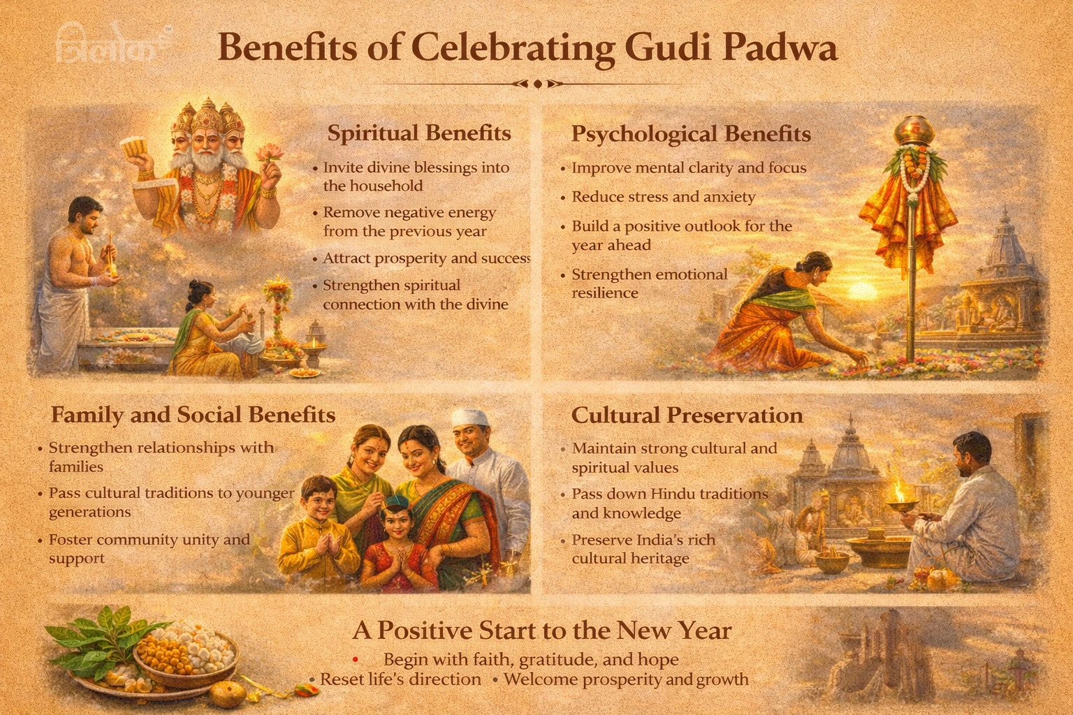 Celebrating Gudi Padwa provides benefits that extend beyond ritual observance. The festival promotes spiritual alignment, emotional renewal, and cultural continuity.